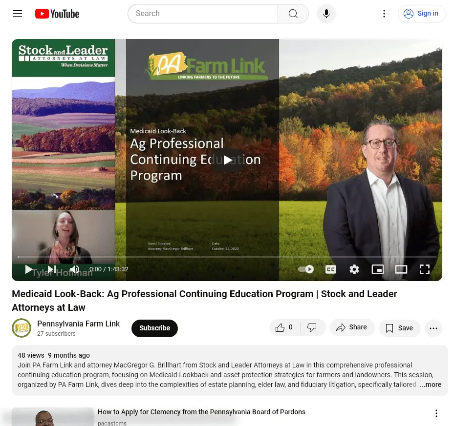 Join PA Farm Link and attorney MacGregor G. Brillhart from Stock and Leader Attorneys at Law in this comprehensive professional continuing education program, focusing on Medicaid Lookback and asset protection strategies for farmers and landowners. This session, organized by PA Farm Link, dives deep into the complexities of estate planning, elder law, and fiduciary litigation, specifically tailored for the agricultural community. Additional Details on Medicaid Annuities: https://www.medicaidplanningassistance.org/eligibility-by-annuity/