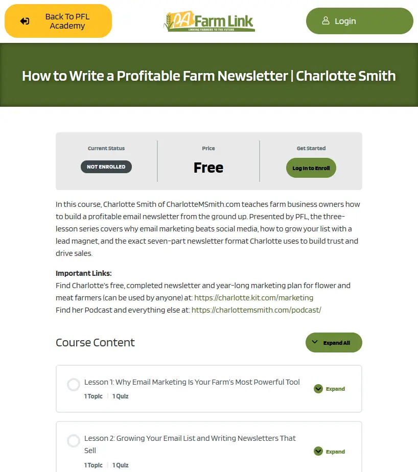 In this three-part course, farm marketing expert Charlotte Smith walks farmers through the core principles of building a brand that actually sells. You’ll learn why logos and farming practices don’t drive sales, how to identify your ideal customer, and how to use a simple four-step formula to create marketing that connects, builds trust, and makes price irrelevant. Whether you are just starting out or hitting a sales ceiling, this course will shift the way you think about marketing your farm.