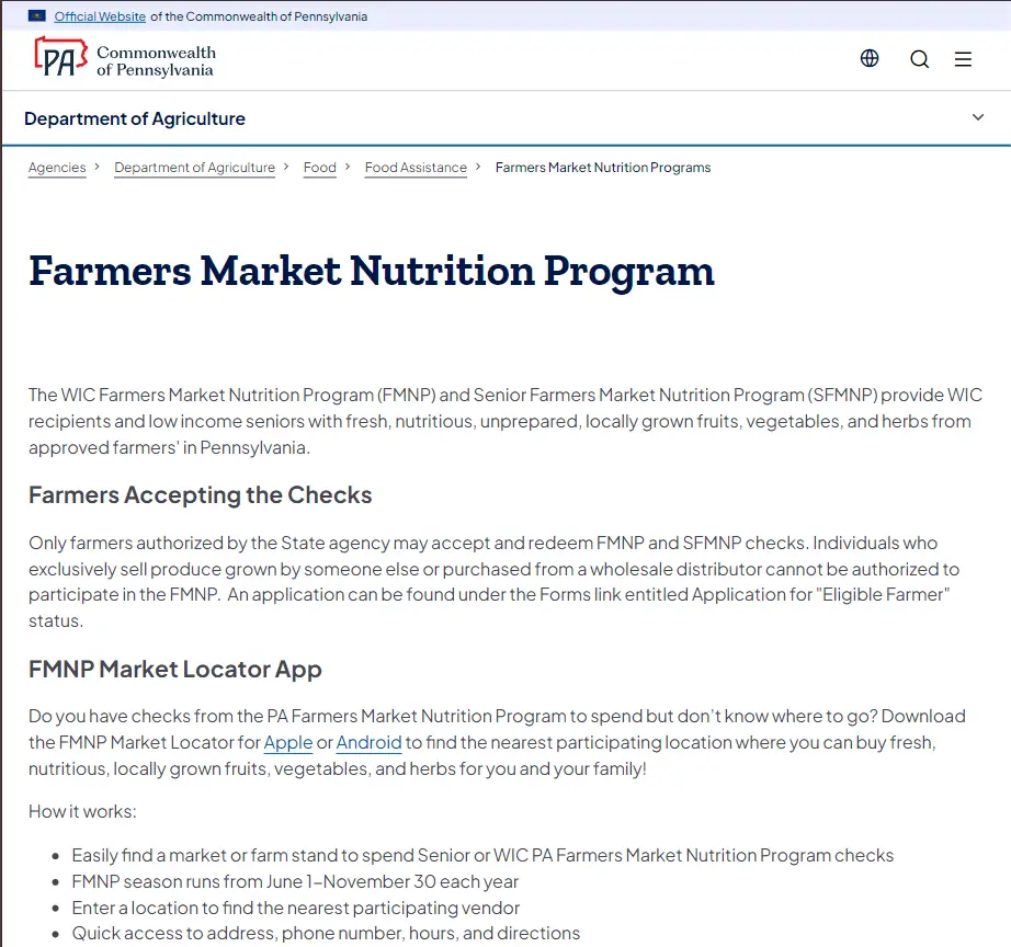 The WIC Farmers Market Nutrition Program (FMNP) and Senior Farmers Market Nutrition Program (SFMNP) provide WIC recipients and low income seniors with fresh, nutritious, unprepared, locally grown fruits, vegetables, and herbs from approved farmers’ in Pennsylvania